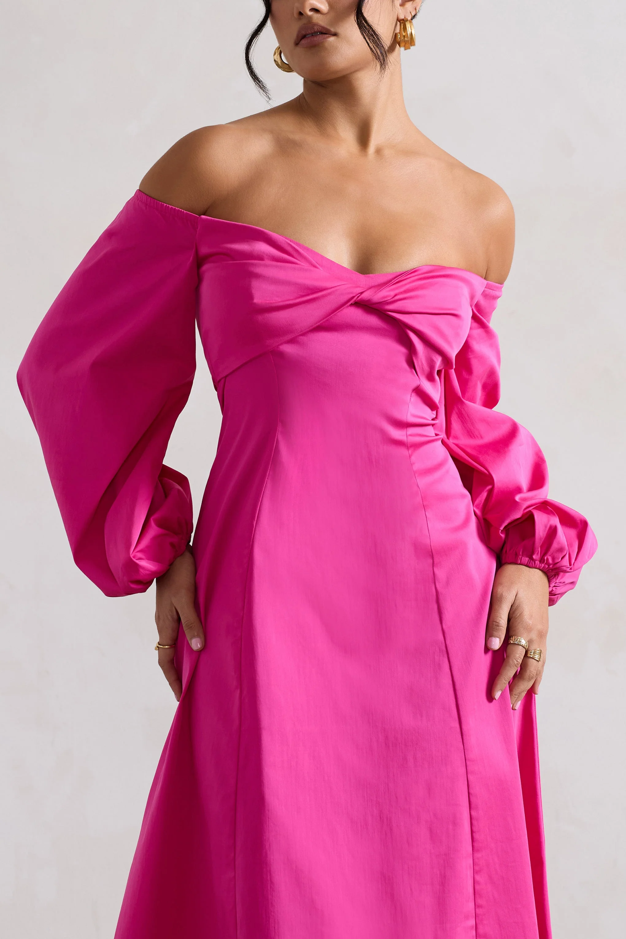 Santino | Vestido midi con mangas abullonadas y escote Bardot retorcido en color ciruela brillante